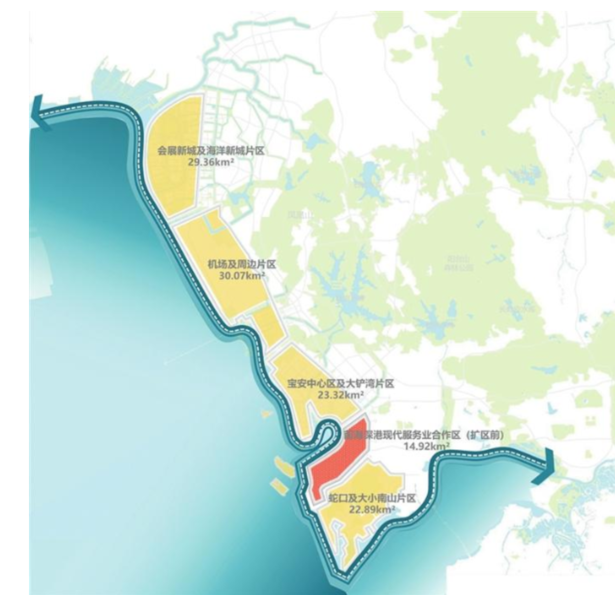 實(shí)施范圍 | 以現(xiàn)有前海合作區(qū)為基礎(chǔ),進(jìn)一步擴(kuò)展至以下區(qū)域: l 南側(cè)毗鄰的蛇口及大小南山片區(qū)〔東至后海大道、近海路、愛榕路、招商路、水灣路,南至深圳灣,西至月亮灣大道、珠江口,北至東濱路,包含中國(guó)(廣東)自由貿(mào)易試驗(yàn)區(qū)的蛇口區(qū)塊〕22.89平方公里; l 北側(cè)毗鄰的會(huì)展新城及海洋新城片區(qū)(東至松福大道,南至福永河,西至海岸線,北至東寶河、沙井北環(huán)路)29.36平方公里; l 機(jī)場(chǎng)及周邊片區(qū)(東至寶安大道,南至金灣大道、寶源路、碧灣路,西至海岸線,北至福永河、松福大道、福洲大道)30.07平方公里; l 寶安中心區(qū)及大鏟灣片區(qū)(東至寶安大道,南至雙界河,西至海岸線,北至金灣大道、寶源路、碧灣路,另包括大小鏟島、孖洲島)23.32平方公里。 |