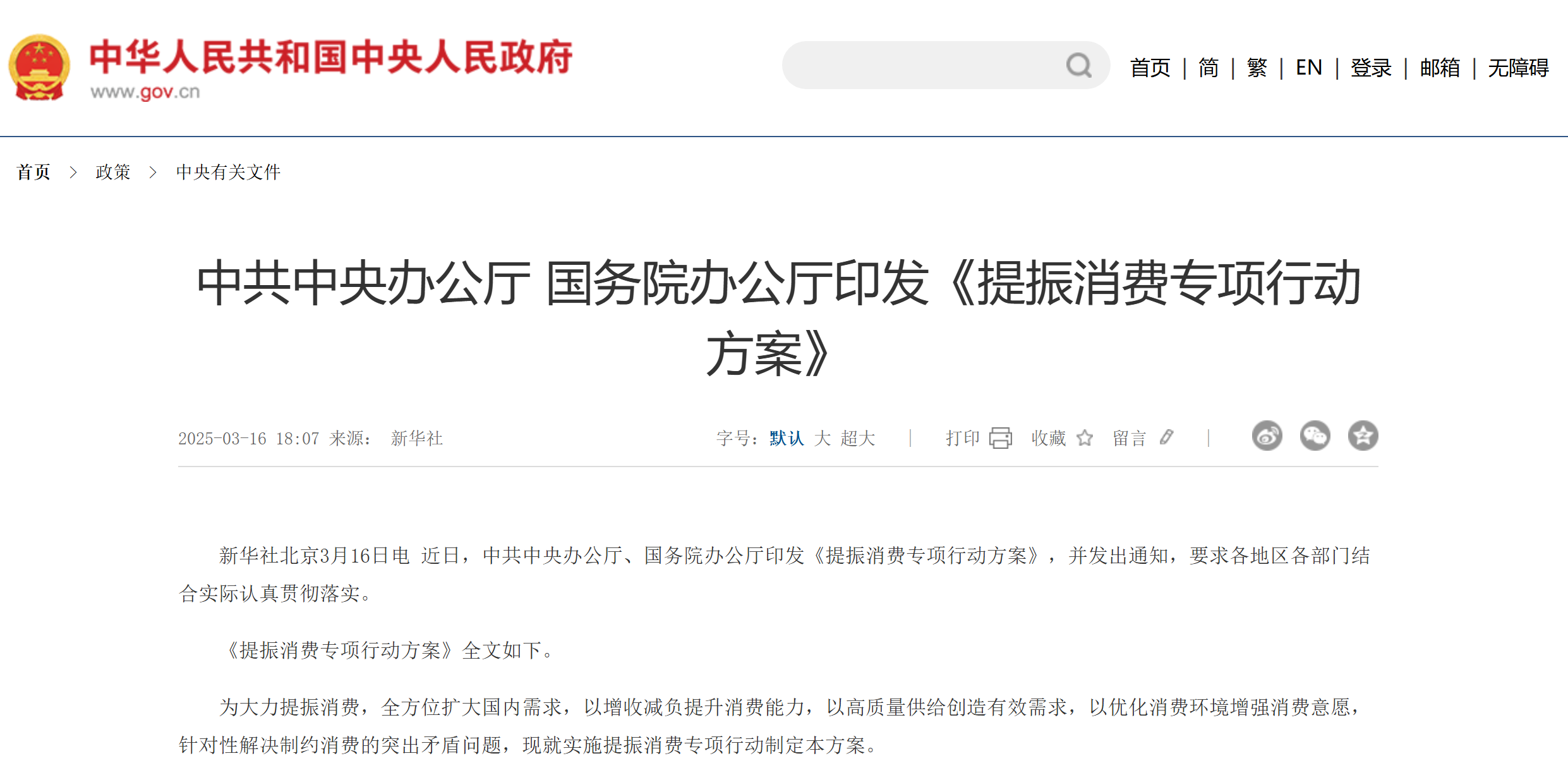 中共中央辦公廳 國務院辦公廳印發(fā)《提振消費專項行動方案》