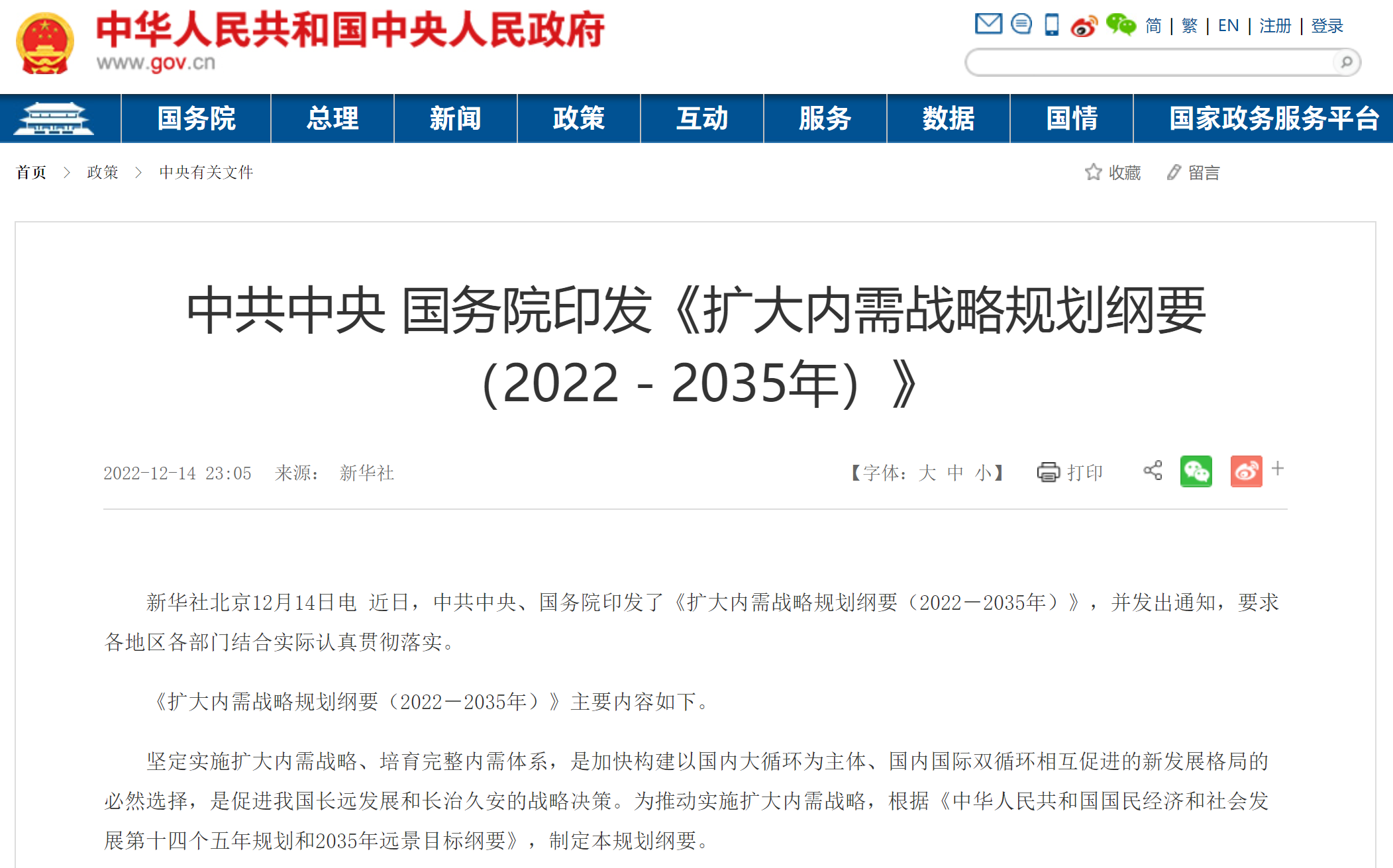 中共中央國(guó)務(wù)院印發(fā)《擴(kuò)大內(nèi)需戰(zhàn)略規(guī)劃綱要(2022-2035年)》